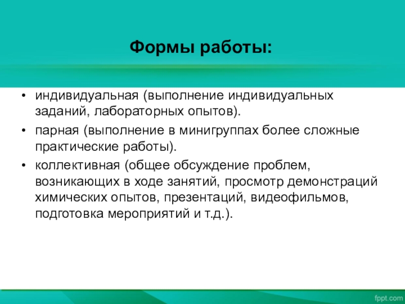 коллективная (общее обсуждение проблем, возникающих в ходе занятий, просмотр демонстраций химических опытов, презентаций, видеофильмов, подготовка мероприятий и т.д.).