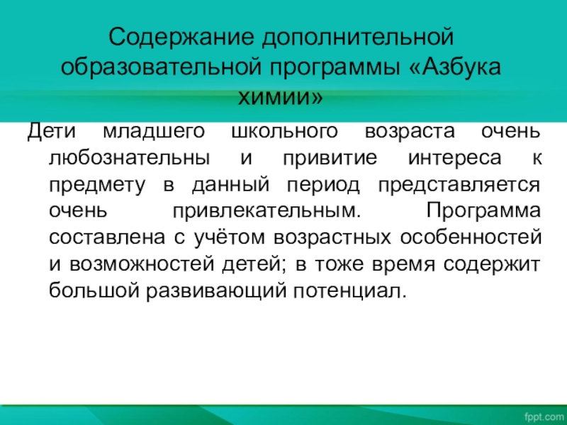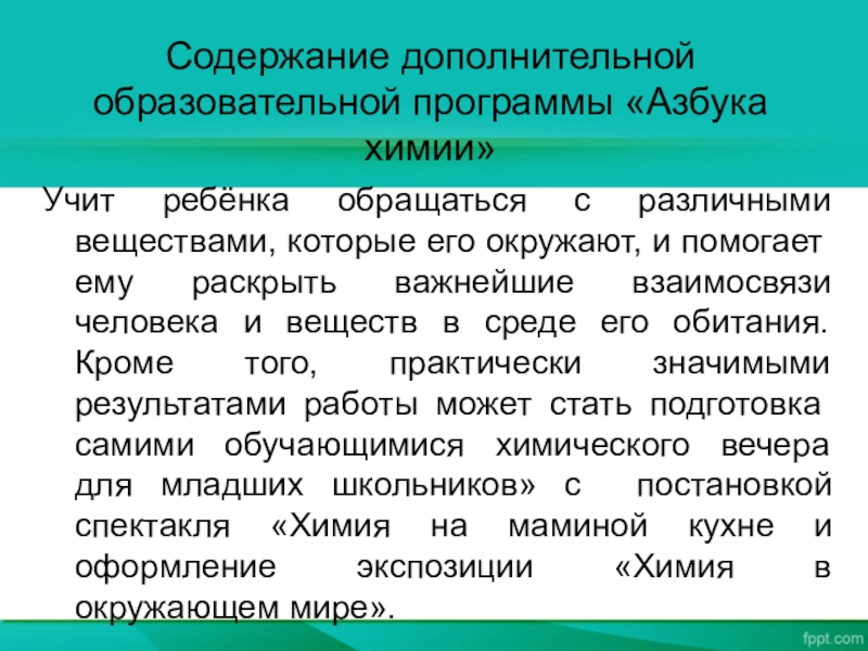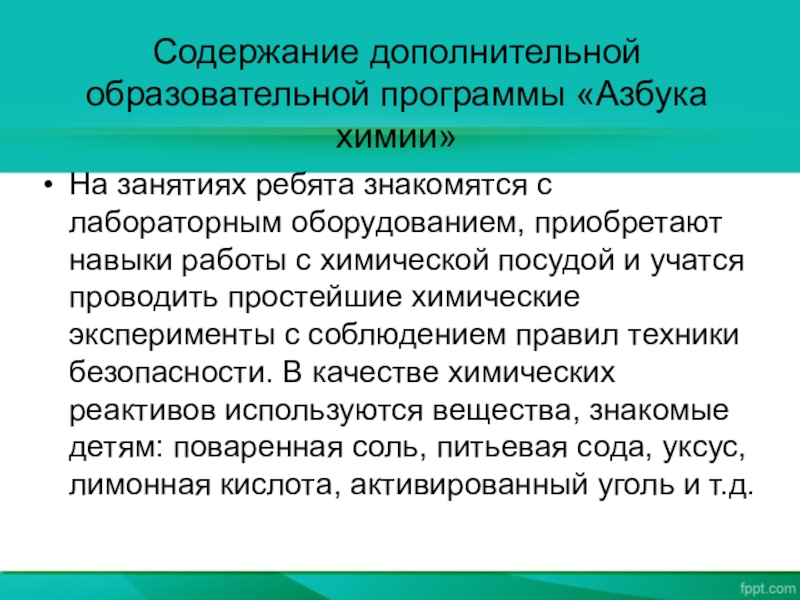 Слайд 5Содержание дополнительной образовательной программы «Азбука химии»