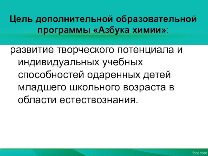 Слайд 6Цель дополнительной образовательной программы «Азбука химии»: