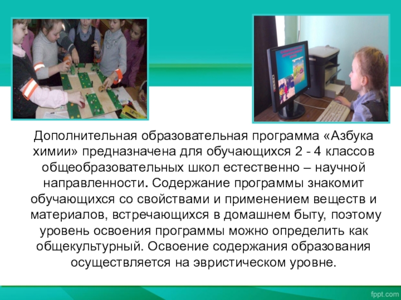 Слайд 2Дополнительная образовательная программа «Азбука химии» предназначена для обучающихся 2 - 4