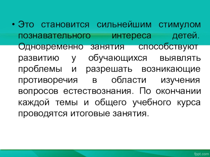 у обучающихся выявлять проблемы и разрешать возникающие противоречия в области изучения вопросов естествознания. По окончании каждой темы и общего учебного курса проводятся итоговые занятия.