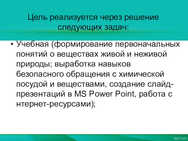 живой и неживой природы; выработка навыков безопасного обращения с химической посудой и веществами, создание слайд-презентаций в MS Power Point, работа с нтернет-ресурсами);