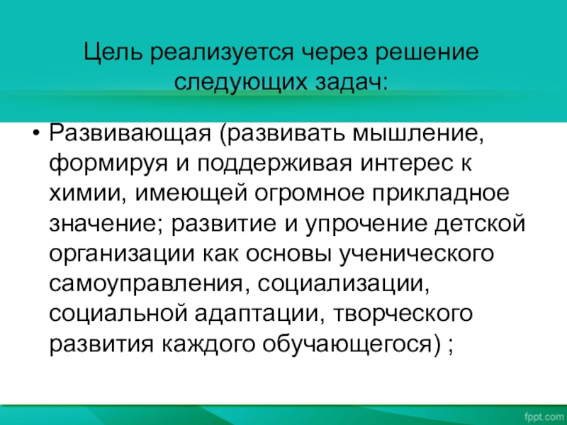интерес к химии, имеющей огромное прикладное значение; развитие и упрочение детской организации как основы ученического самоуправления, социализации, социальной адаптации, творческого развития каждого обучающегося) ;