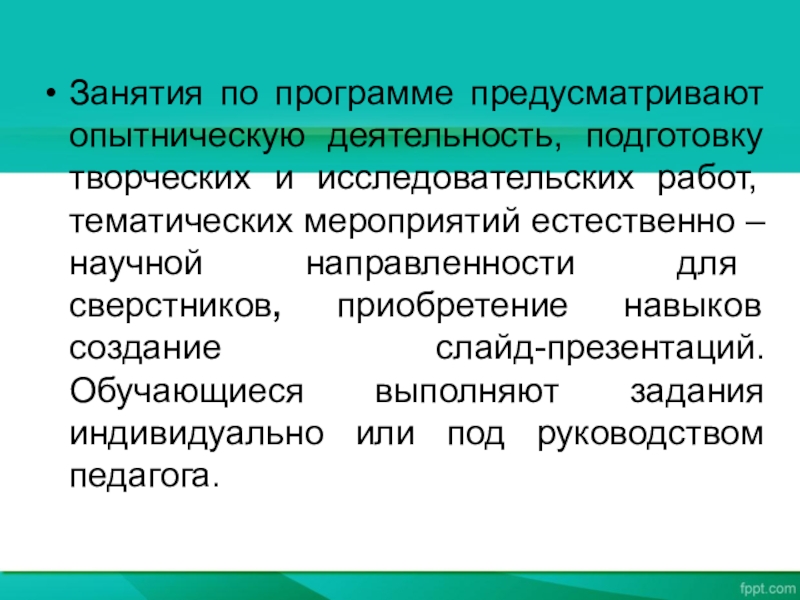 тематических мероприятий естественно – научной направленности для сверстников, приобретение навыков создание слайд-презентаций. Обучающиеся выполняют задания индивидуально или под руководством педагога.
