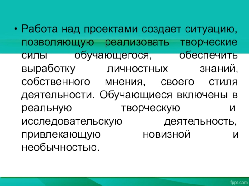 Работа над проектами создает ситуацию, позволяющую реализовать творческие силы обучающегося, обеспечить