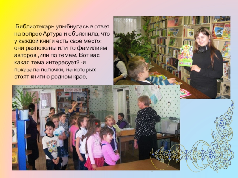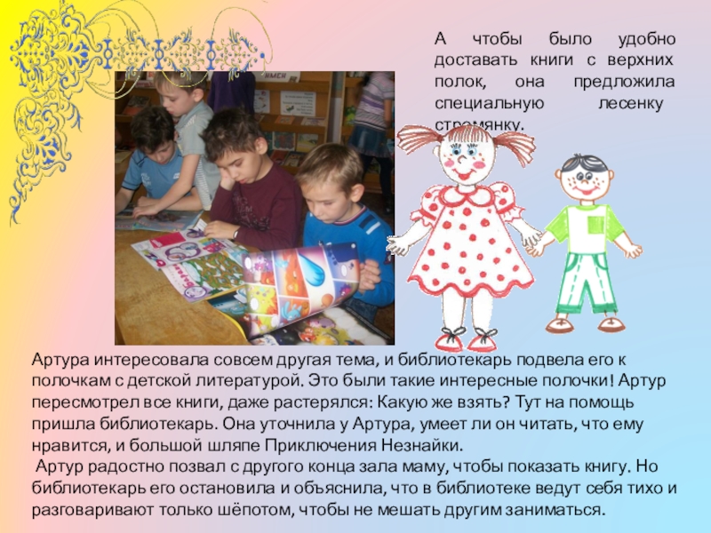 Артура интересовала совсем другая тема, и библиотекарь подвела его к полочкам с детской литературой. Это были такие интересные полочки! Артур пересмотрел все книги, даже растерялся: Какую же взять? Тут на помощь пришла библиотекарь. Она уточнила у Артура, умеет ли он читать, что ему нравится, и большой шляпе Приключения Незнайки.