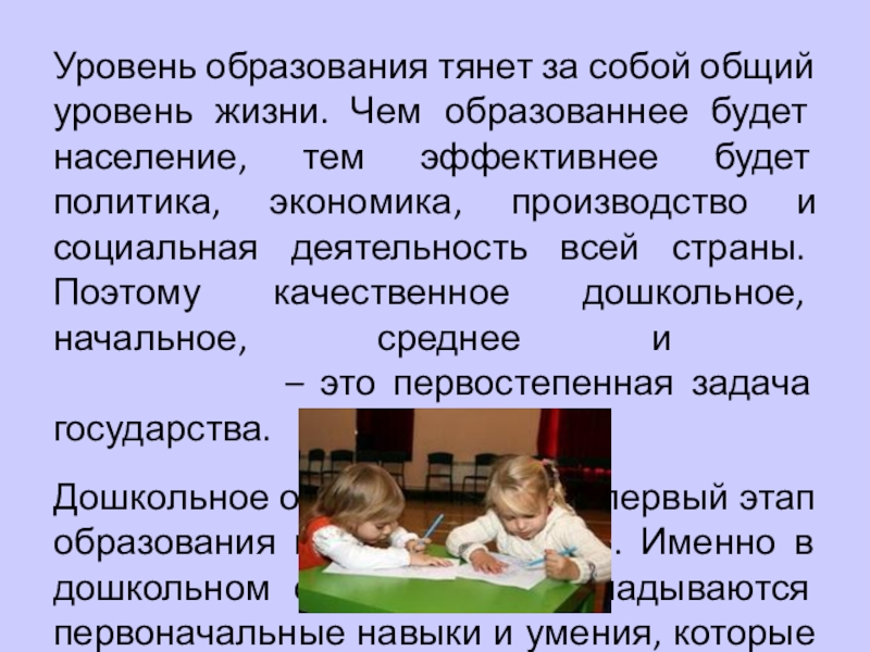 население, тем эффективнее будет политика, экономика, производство и социальная деятельность всей страны. Поэтому качественное дошкольное, начальное, среднее и высшее образование – это первостепенная задача государства.