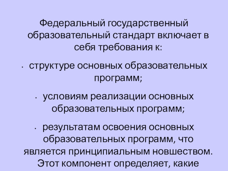 Слайд 6Федеральный государственный образовательный стандарт включает в себя требования к: