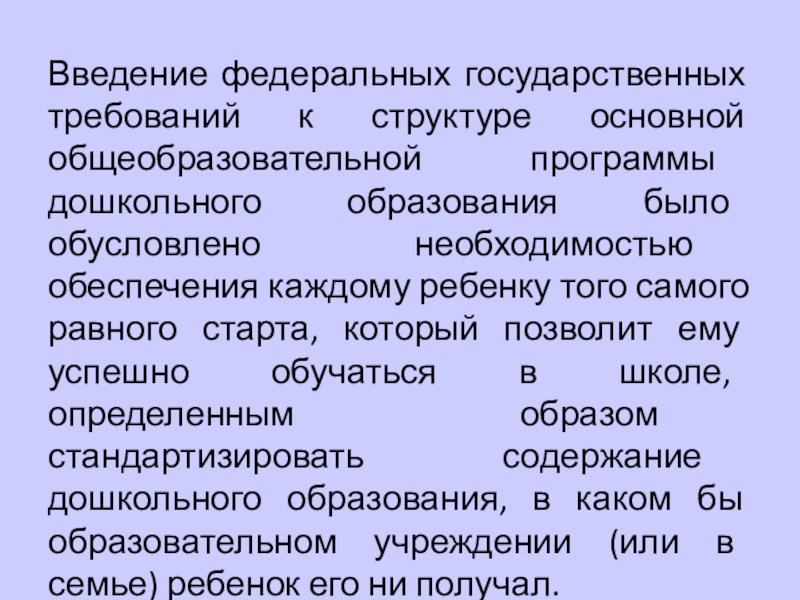 было обусловлено необходимостью обеспечения каждому ребенку того самого равного старта, который позволит ему успешно обучаться в школе, определенным образом стандартизировать содержание дошкольного образования, в каком бы образовательном учреждении (или в семье) ребенок его ни получал.