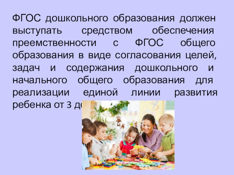Слайд 10ФГОС дошкольного образования должен выступать средством обеспечения преемственности с ФГОС общего