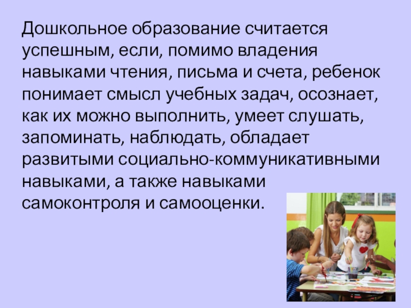 Слайд 8Дошкольное образование считается успешным, если, помимо владения навыками чтения, письма и