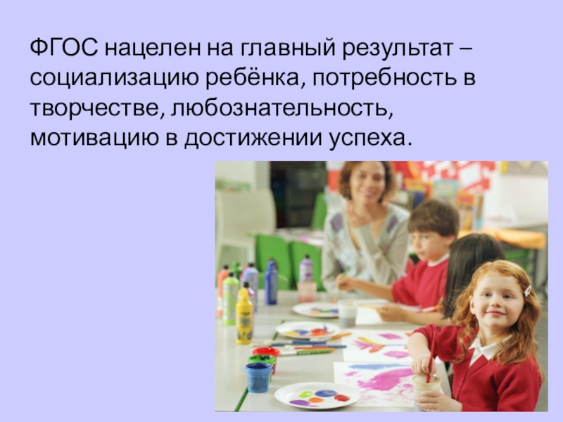 Слайд 7ФГОС нацелен на главный результат – социализацию ребёнка, потребность в творчестве,