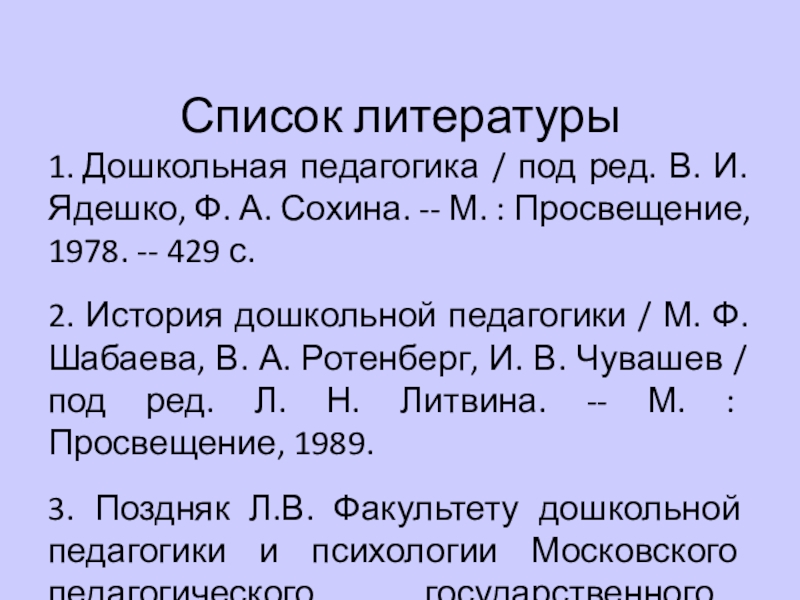 2. История дошкольной педагогики / М. Ф. Шабаева, В. А. Ротенберг, И. В. Чувашев / под ред. Л. Н. Литвина. -- М. : Просвещение, 1989.