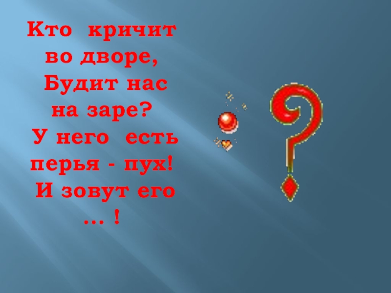 Кто кричит во дворе,  Будит нас на заре?  У него есть перья - пух!