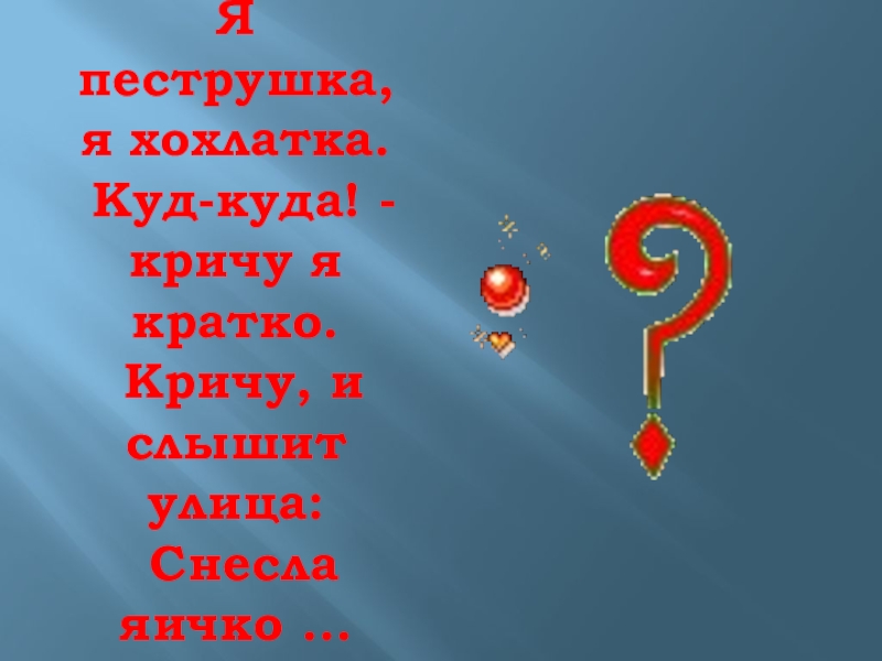 Слайд 4Я пеструшка, я хохлатка. Куд-куда! - кричу я кратко. Кричу, и
