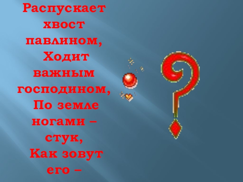 Распускает хвост павлином,  Ходит важным господином,  По земле ногами – стук,  Как зовут его