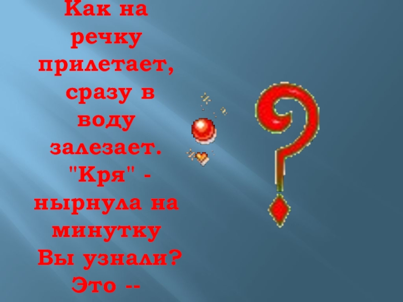 Слайд 8Как на речку прилетает, сразу в воду залезает. "Кря" - нырнула