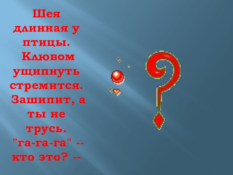 Слайд 6Шея длинная у птицы. Клювом ущипнуть стремится. Зашипит, а ты не