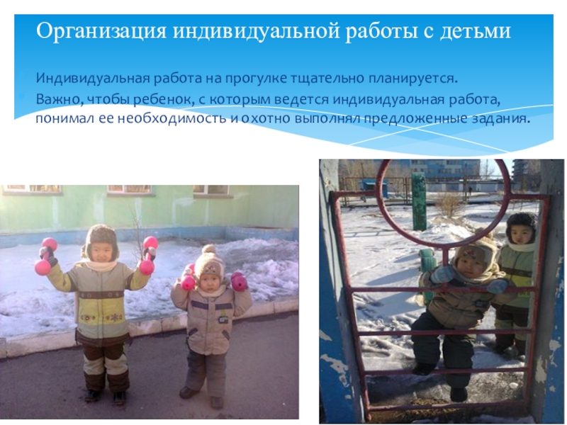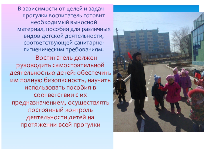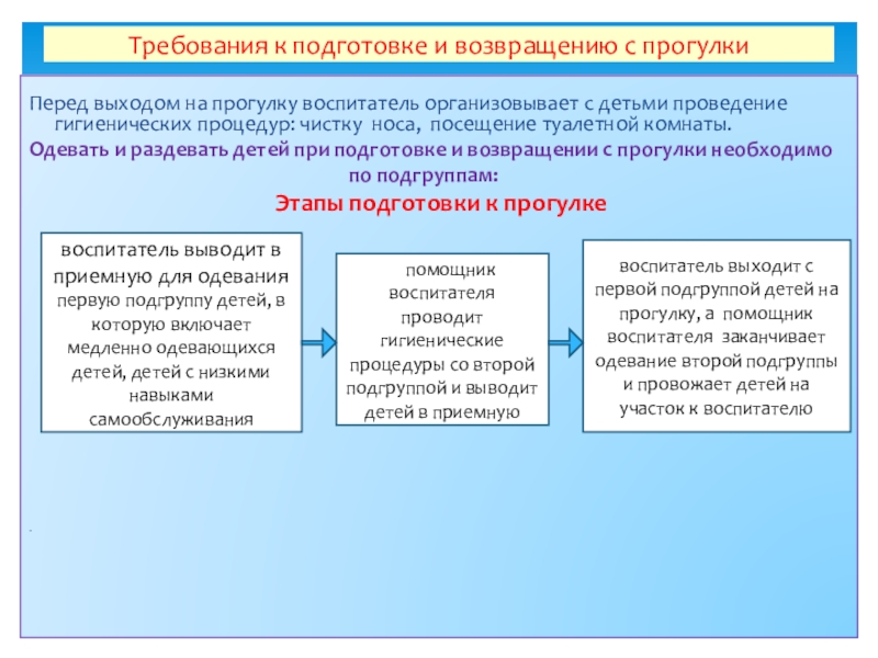 воспитатель выходит с первой подгруппой детей на прогулку, а помощник воспитателя заканчивает одевание второй подгруппы и провожает детей на участок к воспитателю