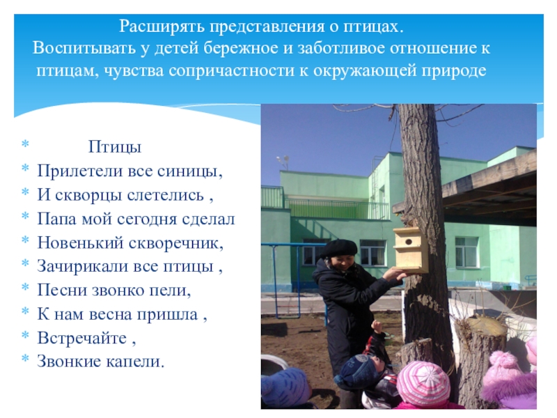 Воспитывать у детей бережное и заботливое отношение к птицам, чувства сопричастности к окружающей природе
