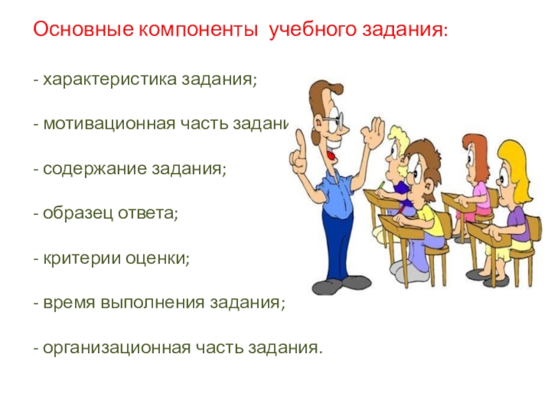 Основные компоненты учебного задания:  - характеристика задания;  - мотивационная часть задания;  - содержание задания;