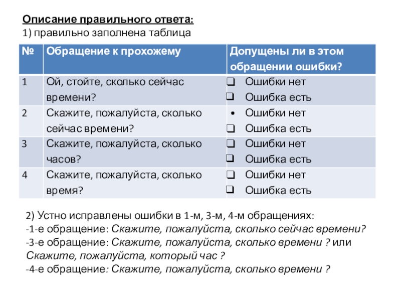 Описание правильного ответа: 1) правильно заполнена таблица 2) Устно исправлены ошибки в 1-м, 3-м, 4-м обращениях:-1-е обращение: