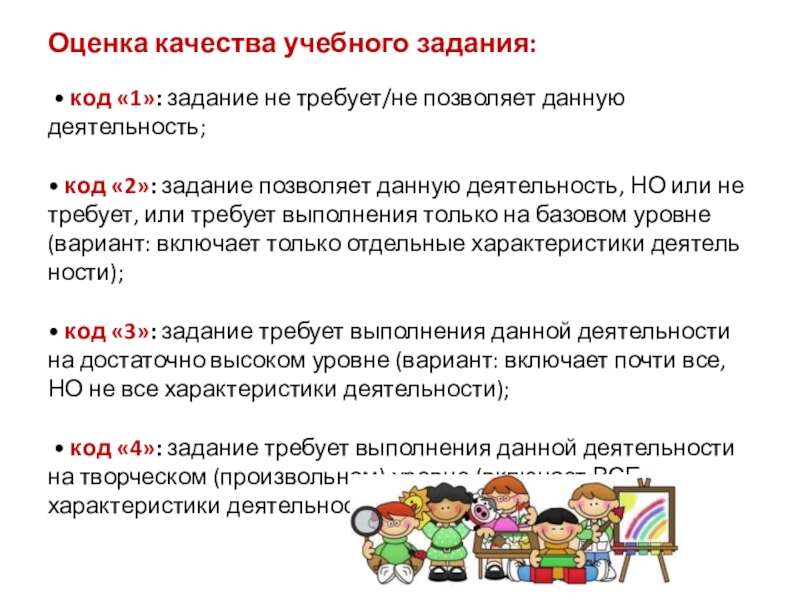 Слайд 8Оценка качества учебного задания: • код «1»: задание не требует/не позволяет