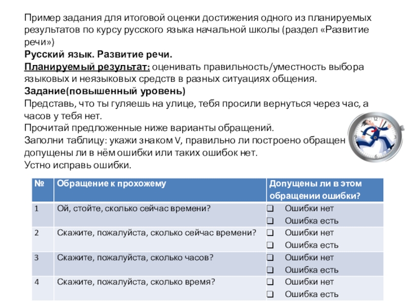 курсу русского языка начальной школы (раздел «Развитие речи») Русский язык. Развитие речи. Планируемый результат: оценивать правильность/уместность выбора языковых и неязыковых средств в разных ситуациях общения. Задание(повышенный уровень) Представь, что ты гуляешь на улице, тебя просили вернуться через час, а часов у тебя нет. Прочитай предложенные ниже варианты обращений. Заполни таблицу: укажи знаком V, правильно ли построено обращение – допущены ли в нём ошибки или таких ошибок нет. Устно исправь ошибки.