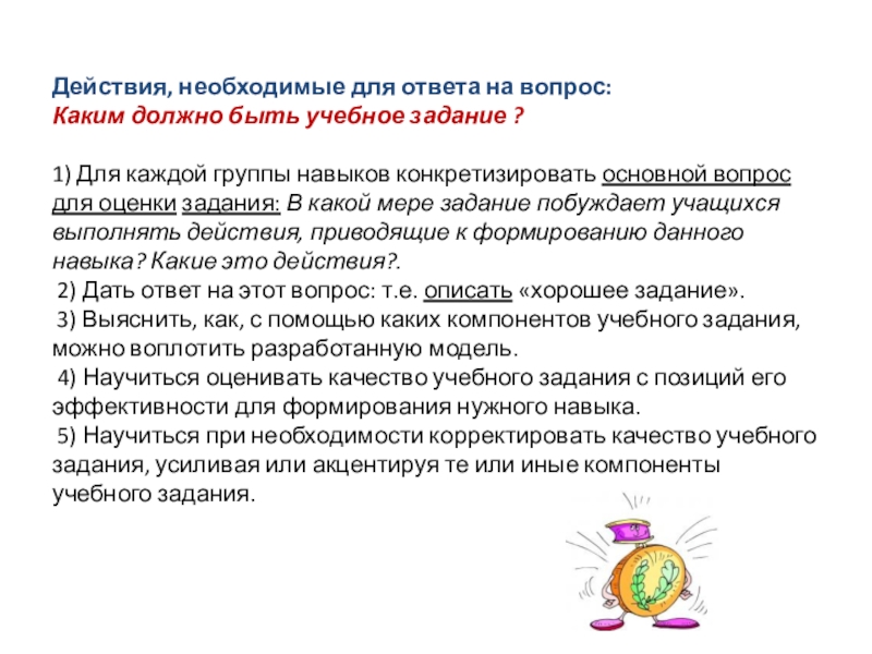 Слайд 9Действия, необходимые для ответа на вопрос: Каким должно быть учебное задание ?