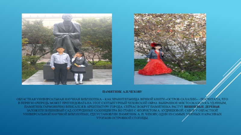 Сахалин» – посчитала, что в первую очередь может претендовать на этот скульптурный чеховский образ. Выбранное место оказалось удачным, памятник гармонично вписался в архитектуру города. Сейчас вокруг памятника растут вишневые деревья. Заложили вишневый сад сотрудники Сахинцентра во главе с флористом А. Кудряшовой. Сквер у областной универсальной научной библиотеки, где установлен памятник А. П. Чехову, один из самых уютных и красивых уголков островной столицы.