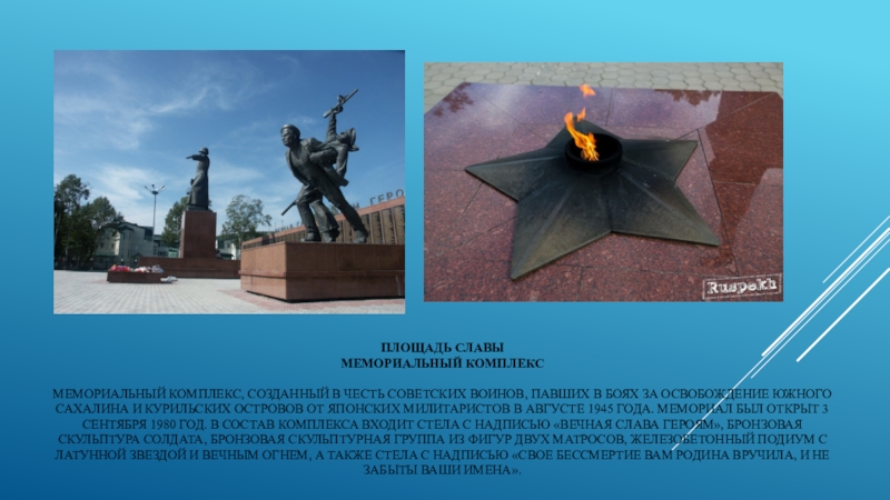 боях за освобождение Южного Сахалина и Курильских островов от японских милитаристов в августе 1945 года. Мемориал был открыт 3 сентября 1980 год. В состав комплекса входит стела с надписью «Вечная слава героям», бронзовая скульптура солдата, бронзовая скульптурная группа из фигур двух матросов, железобетонный подиум с латунной звездой и Вечным огнем, а также стела с надписью «Свое бессмертие вам Родина вручила, и не забыты ваши имена».
