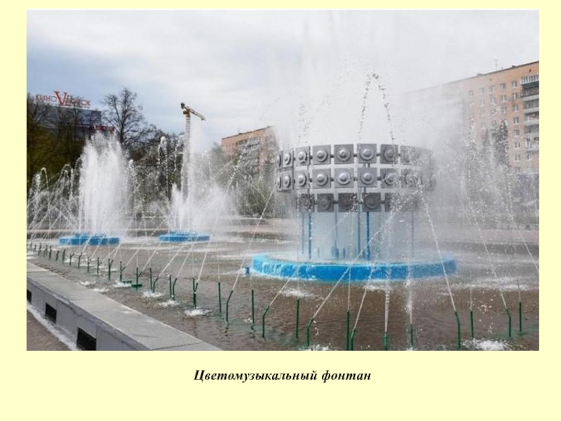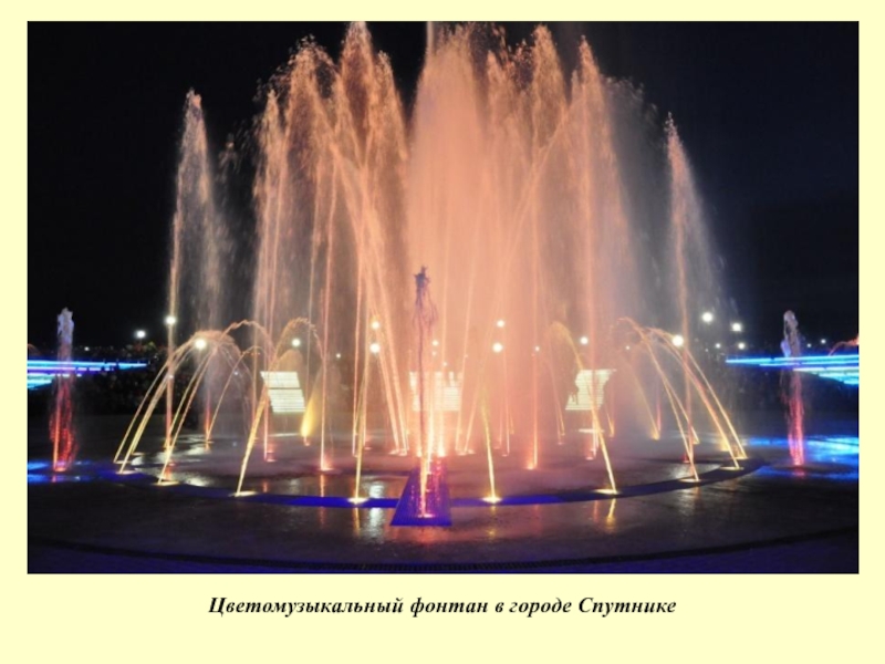 Слайд 16Цветомузыкальный фонтан в городе Спутнике
