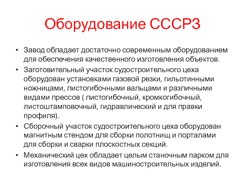 участок судостроительного цеха оборудован установками газовой резки, гильотинными ножницами, листогибочными вальцами и различными видами прессов ( листогибочный, кромкогибочный, листоштамповочный, гидравлический и для правки профиля).