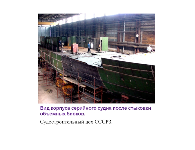 Слайд 17Вид корпуса серийного судна после стыковки объемных блоков.