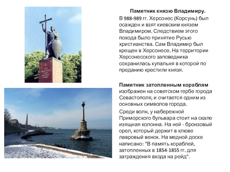 киевским князем Владимиром. Следствием этого похода было принятие Русью христианства. Сам Владимир был крещен в Херсонесе. На территории Херсонесского заповедника сохранилась купальня в которой по преданию крестили князя.