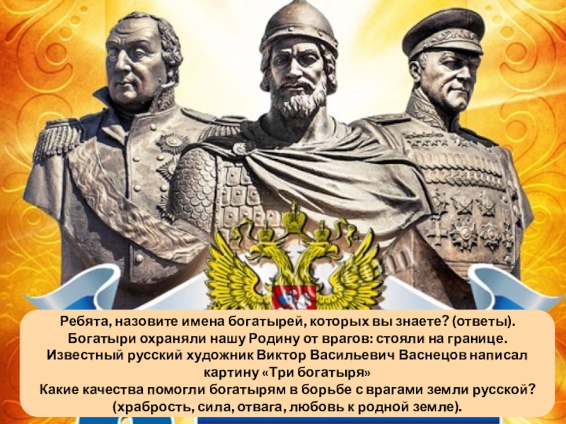Слайд 3Ребята, назовите имена богатырей, которых вы знаете? (ответы).