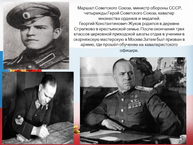 Георгий Константинович Жуков родился в деревне Стрелково в крестьянской семье. После окончания трех классов церковной приходской школы отдав в ученики в скорняжскую мастерскую в Москве.Затем был призван в армию, где прошёл обучение на кавалеристского офицера.