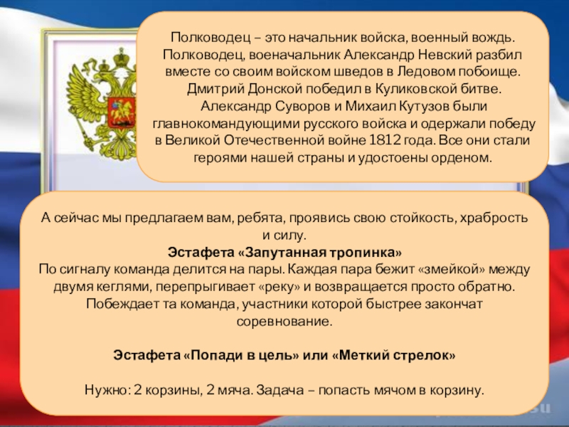 Слайд 9Ребята, а кто такой полководец? (ответы детей). Среди героев Отечества есть