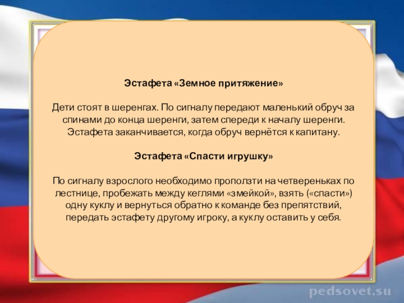 за спинами до конца шеренги, затем спереди к началу шеренги. Эстафета заканчивается, когда обруч вернётся к капитану.