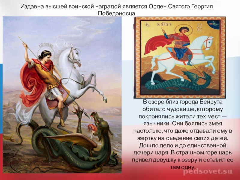 появился всадник в огненно-алом плаще на белоснежном коне - Георгий Победоносец, он пригвоздил копьем змея к земле, а затем попросил царевну обвязать чудище поясом и вести в свой город. Тысячи горожан были поражены подобным чудом.