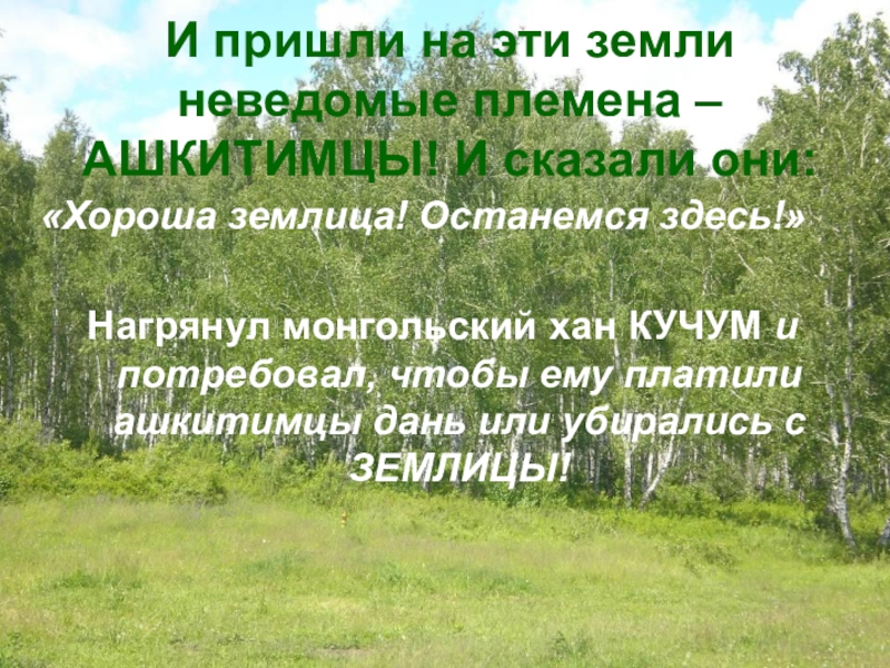 Нагрянул монгольский хан КУЧУМ и потребовал, чтобы ему платили ашкитимцы дань или убирались с ЗЕМЛИЦЫ!