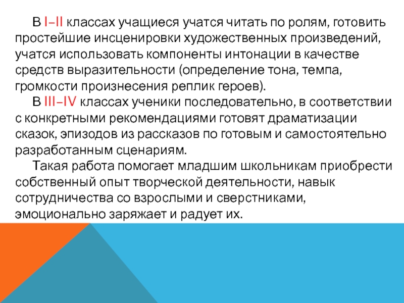Слайд 22 В I–II классах учащиеся учатся читать по ролям,