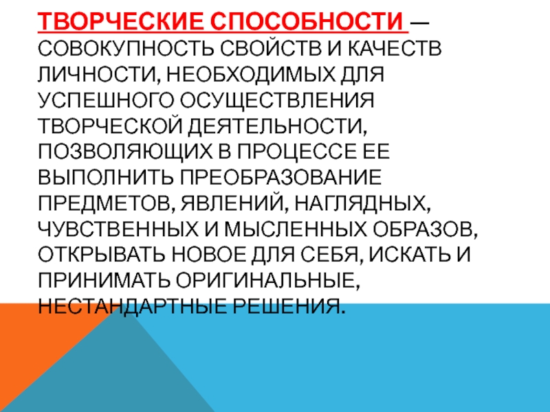 Слайд 3Творческие способности — совокупность свойств и качеств личности, необходимых для успешного