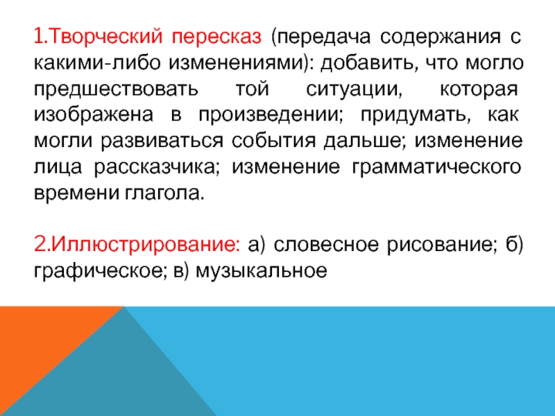 Слайд 81.Творческий пересказ (передача содержания с какими-либо изменениями): добавить, что могло предшествовать