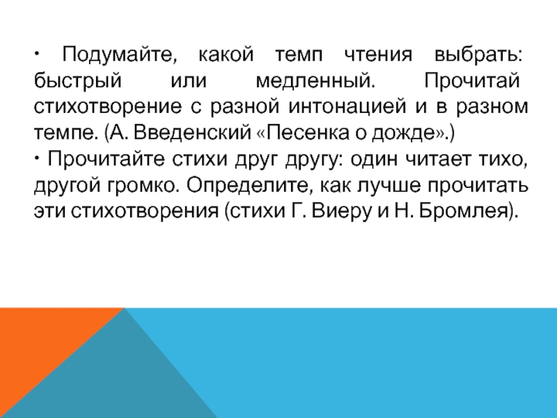 Слайд 18• Подумайте, какой темп чтения выбрать: быстрый или медленный. Прочитай стихотворение