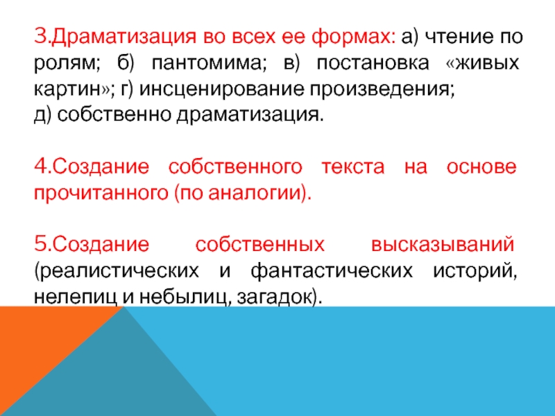 Слайд 93.Драматизация во всех ее формах: а) чтение по ролям; б) пантомима;