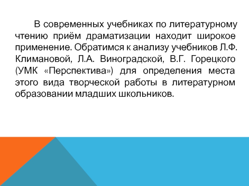 драматизации находит широкое применение. Обратимся к анализу учебников Л.Ф. Климановой, Л.А. Виноградской, В.Г. Горецкого (УМК «Перспектива») для определения места этого вида творческой работы в литературном образовании младших школьников.