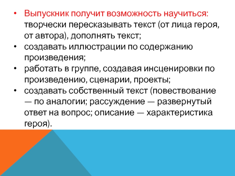 Слайд 6Выпускник получит возможность научиться: творчески пересказывать текст (от лица героя, от
