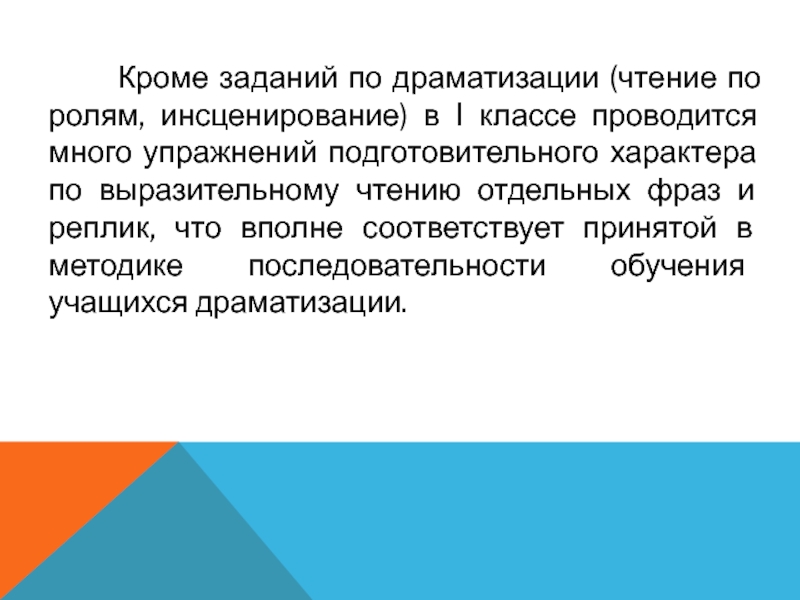 инсценирование) в I классе проводится много упражнений подготовительного характера по выразительному чтению отдельных фраз и реплик, что вполне соответствует принятой в методике последовательности обучения учащихся драматизации.