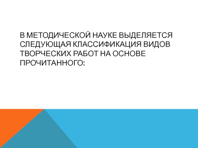 Слайд 7В методической науке выделяется следующая классификация видов творческих работ на основе